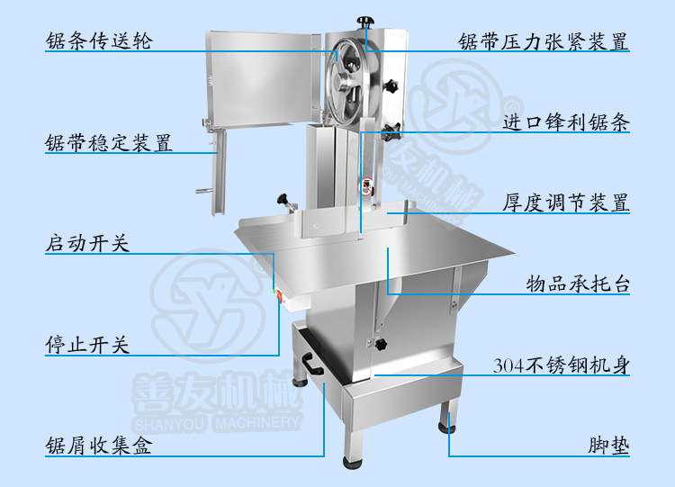 立式锯骨机加工产品厚度可调节:可适应不同客户订单。自动锯骨机带有手柄操作,可保证工人的操作安全。采用最新技术和全不锈钢制造(适应各种加工环境)。电机、驱动机构布置精确合理,动力强大,同时可以让运转更平稳可靠。锯条的上侧和下方均布置有合金导向块,立式锯骨机价格非常具有性价比、使锯条运行平直,运行稳定可靠。