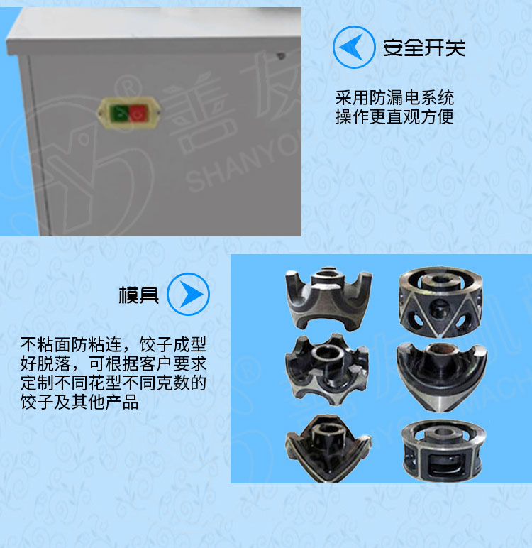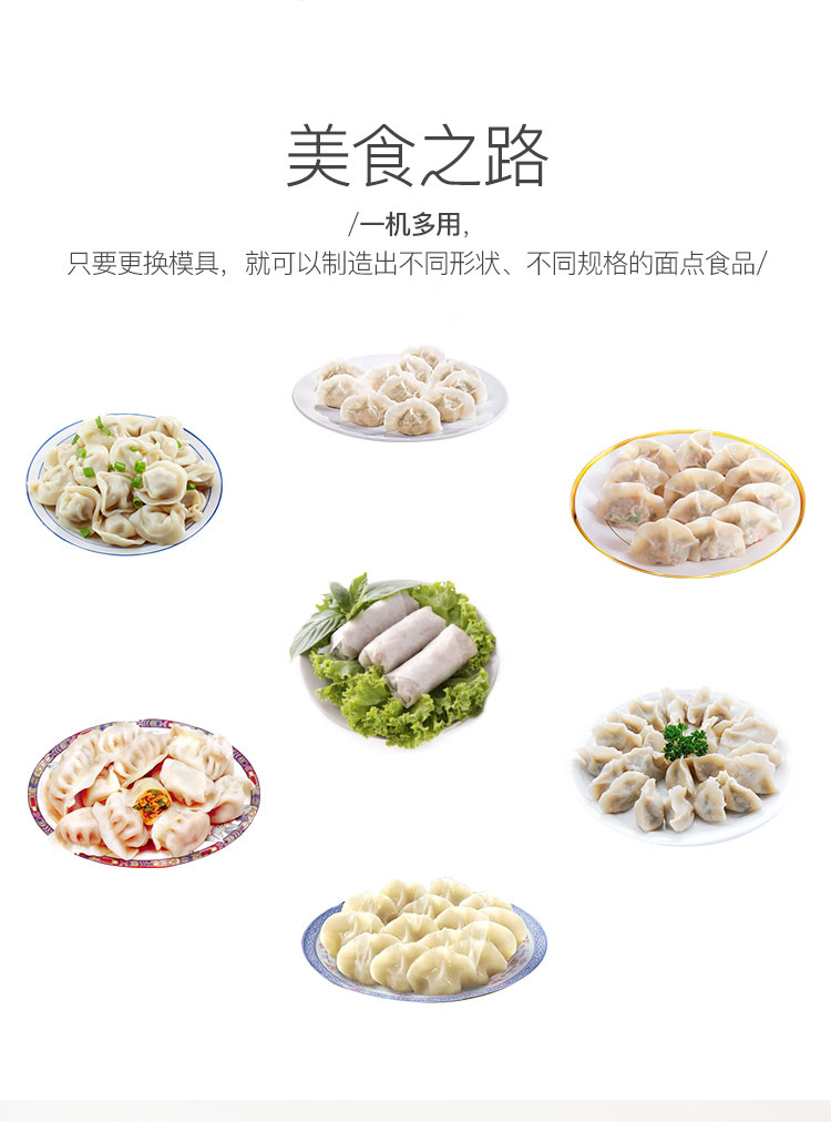 1、 一机多用途:只要更换模具,就可以制造不同的食品:春卷、馄饨、火锅水饺、珍珠水饺、咖喱饺子、花边饺子、锅帖饺子。